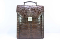 Мужская сумка А4 из крокодиловой кожи, вертикальный планшет из натуральной крокодиловой кожи темно-коричневого цвета. Ширина-28см. Высота-36см. Толщина-9см. Для пошива сумок данной модели используется натуральная, фактурная крокодиловая кожа. На лицевой поверхности сумки устроен откидывающийся вверх лицевой клапан, основным украшением лицевого клапана является фактурная затылочная часть крокодиловой шкуры. В нижней части клапан фиксируется на кодовый замок. Ниже лицевого клапана на лицевой поверхности сумки мы видим спинную фактуру крокодиловой шкуры. Обратная часть сумки выполнена из натуральной крокодиловой кожи со спинной фактурой кожи крокодила. В верхней части сумки вшита удобная ручка, ручка выполнена на основании из кожи теленка и имеет отделку кожей крокодила. Для повешенной эластичности сумки, боковые вставки симки и дно сумки выполнено из натуральной кожи теленка, кожа теленка по цвету подобрана под цвет крокодиловой кожи. В верхней части боковых поверхностей сумки расположены кольца для крепления съёмного плечевого ремня. Съемный плечевой ремень, с регулировкой по длине, выполненный на основании из кожи теленка, с отделкой внешней поверхности кожей крокодила поставляется в комплекте с крокодиловой сумкой. На лицевой поверхности сумки, под лицевым клапаном устроен удобный, карман на гармошках слева и справа. Плоским карманом на молнии, внутренний объем сумки разделен на две части в данную сумку можно поместить документы формата А4 в вертикальном положении. Для дополнительного удобства пользования внутри сумки устроены дополнительные карманы объемный накладной и для пишущих принадлежностей. В качестве материала подклада используется натуральная кожа теленка и текстиль.