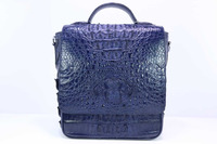 Мужская вертикальная плечевая сумка-планшет темно-синего цвета из натуральной крокодиловой кожи. Сумка средне размерная, компактная ширина- 22см, высота-26см, толщина-8см. Для пошива сумок данной модели используется натуральная фактурная кожа сиамского крокодила, кожа высокого качества выделки и окраса, мягкая, эластичная и очень приятная на ощупь. На лицевой стороне сумки устроен большой откидывающийся вверх лицевой клапан, это клапан украшен крупной симметричной затылочной частью крокодиловой шкуры. В нижней части клапан фиксируется к сумке на металлических магнитных кнопках, вшитых в нижней части внутри клапана. Обратная часть сумки отшита из крокодиловой кожи со спинной фактурой. Боковые вставки сумки выполнены из кожи крокодила с хвостовой фактурой, дно сумки изготовлено с применением крокодиловой кожи с гладкой фактурой. В верхней части сумки, вверху на лицевом клапане расположена удобная ручка, ручка изготовлена на основании из кожи теленка с отделкой крокодиловой кожей. На боковых поверхностях сумки, вверху вшиты металлические D-образные кольца для крепления съемного плечевого ремня. Съемный плечевой ремень с возможностью регулировки по длине выполнен на основании из натуральной кожи теленка, цвет кожи теленка подобран под цвет крокодиловой кожи. В качестве дополнительного украшения внешняя часть плечевого ремня имеет отделку кожей крокодила. Внутри сумки, под лицевым клапаном устроено восемь отделений для различных карточек и один плоский карман устроенный на всю ширину сумки. В верхней части сумки, под лицевым клапаном вшита металлическая молния преграждающая доступ в основной объем сумки. Сумка внутри выполнена в одном объеме, для удобства пользования сумкой внутри устроены карманы для предметов первой необходимости, сдвоенный накладной карман и боковой карман на молнии. В качества материала подклада сумки применена натуральная кожа теленка, цвет кожи теленка подобран под цвет крокодиловой кожи.