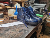 Высокие крокодиловые кеды, пара отшита мастером из натуральной кожи сиамского крокодила, ручная сборка, цвет темно-синий, пара отшита по индивидуальному заказу. Если у Вас появились вопросы и или Вы хотите заказать индивидуальный пошив обуви, напишите нам, и мастер свяжется с Вами напрямую, общение с мастером без посредников, для обсуждения всех ваших вопросов, а также подскажет все о сроках и шагах при индивидуальном пошиве обуви, снятие мерки, изготовление примерочного макета и т.д. Мастер обладает многолетним опытом и владеет различными техниками пошива обуви любой сложности и любых моделей. Также вы можете заказать пошив кожгалантереи сумки, портфели, ремни, кошельки из различных сортов кожи кожа крокодила, кожа морского ската, кожи питона и т.д.