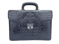 Классический мужской портфель формата А4 из крокодиловой кожи, кожа крокодила кайман, кожа высокого качества выделки, кожа мягкая, эластичная и очень приятная на ощупь. Портфель данной модели является классическим среднеформатным, но довольно вместительным, удобным и практичным. На лицевой поверхности расположен откидывающийся вверх лицевой клапан, клапан украшен красивой, симметричной затылочной частью крокодиловой шкуры. В нижней части клапан фиксируется на кодовый замок. Лицевая часть, расположенная ниже лицевого клапана, выполнена из кожи крокодила с неповторимой по своей природной фактуре и узору спинной частью крокодиловой кожи. Обратная часть портфеля выполнена с применением крокодиловой кожи со спинной фактурой. На обратной стороне портфеля в верхней его части устроен удобный плоский карман. В верхней части портфеля из крокодиловой кожи расположена ручка, ручка выполнена из кожи крокодила под цвет изделия. Боковые поверхности портфеля, для большей эластичности выполнены из кожи теленка под цвет изделия. На боковых поверхностях также располагаются кольца для крепления съемного плечевого ремня. Давайте рассмотрим из чего этот портфель состоит внутри: На лицевой части, той, что располагается ниже лицевого клапана и выполнена из кожи крокодила с фактурной спинной частью, в верхней части устроен удобный плоский карман. Плоским отделением на молнии основной объем крокодилового портфеля разделен на два отделения. В дном из отделений устроен удобный накладной карман на молнии, в другом отделении выполнены два приспособления для пишущих инструментов и отделения для карточек. Съемный, регулируемый по длине плечевой ремень, выполненный из кожи теленка, с отделкой из крокодиловой кожи, в комплекте. В качестве материала подклада данного портфеля из крокодиловой кожи была применена кожа теленка под цвет изделия и текстиль.