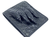 Мужской крокодиловый кошелек с натуральной крокодиловой лапой черного цвета. Уникальный и очень оригинальный кошелек, прекрасный впечатляющий подарок по доступной цене. Кошелек классический, двуслкладный, стандартного размера. Натуральная кожа сиамского крокодила и натуральная лапа сиамского крокодила используется фабрикой для пошива кошельков данной модели. Лицевая поверхность кошелька украшена натуральной лапой крокодила, лапа объемная, с пальцами и когтями. Обратная часть кошелька выполнена из натуральной кожи крокодила из гладких частей крокодиловой шкуры. Внутри кошелек состоит из двух отделений для банкнот, по четыре отделения для различных карточек на каждой стороне кошелька, откидывающимся вверх отделением с двумя прозрачными окошками, по одному на каждой стороне и с двумя плоскими кармашками на каждой стороне. И с двумя дополнительными удобными плоскими кармашками, расположенными под слотами для карточек с доступом из центральной части кошелька. Натуральная кожа теленка, подобранная по цвету под цвет кожи крокодила и текстиль используется в качестве материала подклада данных крокодиловых кошельков.