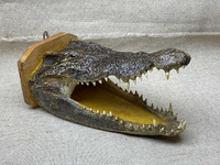 Для изготовления настенной головы крокодила используется натуральная крокодиловая голова, голову выделывают специально с сохранением натурального серо-темно-зеленого окраса крокодила. В качестве дополнительного украшения в крокодиловую голову вставили искусственные глаза желто-черного цвета. В пасти крокодила подбородочная часть выполнена воском желтого цвета, в пасти крокодила в наличии верхние и нижние крокодиловые зубы. Крокодиловая голова прикреплена к доске и готова украсить собой стенку в любом винном погребе, в любой комнате, кабинете, крокодиловой голове везде найдется место на стене. Натуральная крокодиловая голова покрыта лаком, ее удобно чистить и даже протирать влажной тряпочкой от пыли. Эта настенная крокодиловая голова весит 2,5кг без упаковки, вес средний.
