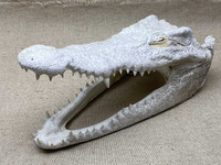 Натуральный крокодиловый череп, череп сиамского крокодила цвета Гималаи длиной -38см, вес этого черепа без упаковки 1,5кг. Это натуральный крокодиловый череп, выделка черепа была произведена с частичным отбеливанием крокодиловой кожи, в результате чего более светлые части крокодиловой кожи стали практически белыми, а темно-зеленые пятна на коже крокодила превратились в серо-коричневые. Крокодиловый череп в натуральной крокодиловой коже, крокодиловая пасть открыта на 12-13см ширины. Внутри пасти крокодила вы можете видеть полный комплект крокодиловых зубов, как на нижней, так и на верхней челюсти. Данный крокодиловый череп может украсить любое помещение будь то, винный погреб, охотничий домик, кабинет или гостиная комната.