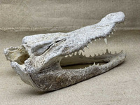 Натуральный крокодиловый череп, череп сиамского крокодила цвета Гималаи длиной -40см, вес этого черепа без упаковки 1,7кг. Это натуральный крокодиловый череп, выделка черепа была произведена с частичным отбеливанием крокодиловой кожи, в результате чего более светлые части крокодиловой кожи стали практически белыми, а темно-зеленые пятна на коже крокодила превратились в серо-коричневые. Крокодиловый череп в натуральной крокодиловой коже, крокодиловая пасть открыта на 13-14см ширины. Внутри пасти крокодила вы можете видеть полный комплект крокодиловых зубов, как на нижней, так и на верхней челюсти. Данный крокодиловый череп может украсить любое помещение будь то, винный погреб, охотничий домик, кабинет или гостиная комната.