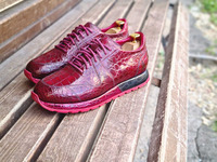 Спортивная пара обуви из крокодиловой кожи, крокодиловые кроссовки, кроссовки из кожи крокодила, цвет красный. Эта пара была отшита мастером по индивидуальному заказу. Вы можете заказать подобную пару обуви из крокодиловой кожи в вашем любимом цвете. Если у Вас появились вопросы по этой паре и или Вы хотите заказать индивидуальный пошив, дайте нам знать и Мастер, который будет непосредственно заниматься пошивом Вашей пары, свяжется с Вами, ответит на все интересующие Вас вопросы. Для пошива этой пары кроссовок из крокодиловой кожи была использована натуральная кожа сиамского крокодила, брюшная часть и гладкие части крокодиловой шкуры. Кроссовки выполнены на высокой подошве «трактор», край подошвы отделан крокодиловой кожей двух цветов, красной и черной в виде вставки в районе пятки. В качестве дополнительного украшения внутренние стельки имеют вставки из крокодиловой кожи под цвет изделия. Ориентировочный срок пошива этой пары кроссовок из кожи крокодила 4-6 недель.