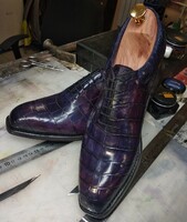 Классическая пара мужской обуви из крокодиловой кожи темно-фиолетового цвета, для изготовления этой пары обуви использована кожа крокодила высочайшего качества выделки. Отличительной особенностью данной пары является ее цельнокройность, пара выкроены и сшита из целых кусков крокодиловой кожи от носка, до пятки. Удобная противоскользящая подошва, материал подклада высшего качества, ортопедическая съемная стелька, все материалы высшего качества, полное внимание в деталям, ручная работа, ручное окрашивание.
