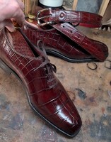 Классическая бесшовная пара мужской обуви из крокодиловой кожи цвета красного вина, темно-вишневого цвета. Для изготовления этой пары обуви использована кожа крокодила высочайшего качества выделки. Отличительной особенностью данной модели является цельнокройность, а именно выкройка выполнена из цельного куска кожи крокодила, без швов и ставок, полуботинки от носка до пятки выполнены из одного, единого куска кожи крокодила. Цельнокройность обуви повышает как ее статусность, так и цену. Неповторимый природный узор крокодиловой кожи, подчеркнет индивидуальность вашей обуви. . Удобная противоскользящая подошва, материал подклада высшего качества, ортопедическая съемная стелька со вставкой из крокодиловой кожи под цвет изделия, все материалы высшего качества, полное внимание в деталям ручная работа, ручное окрашивание.