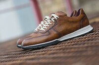 Мужская спортивная пара обуви для повседневной носки, индивидуальный пошив, ручная сборка, ручное окрашивание. Удобная противоскользящая черно-белая подошва удачно сочетается с белыми шнурками. Пара отшита для клиента из гладкой кожи теленка (КРС) На первом фото вы видите завершенный вид обуви, готовый, окрашенный. А на фото номер два вы видите туфлю из этой пары в еще не окрашенном виде, сразу после пошива. Качественная съемная ортопедическая стелька, материал подклада высшего качества, внимание к деталям.