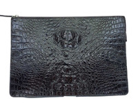 Крокодиловая папка для бумаг и документов формата А4 из фактурной кожи крокодила темно-коричневого цвета. Натуральная крокодиловая кожа, кожа сиамского крокодила спинная часть используется фабрикой для создания сумок данной модели. Лицевая сторона папки украшена крокодиловой кожей с фактурным затылком, переходящим в спинную часть, обратная сторона папки выполнена с применением кожи крокодила со спинной фактурой. Боковые вставки папки и дно выполнены с применением натуральной кожи теленка, это придает папке больше эластичности. На обратной стороне папки расположено металлическое D-образное кольцо для крепления съемной ручки. Съемная ручка в виде петельки изготовлена из натуральной кожи теленка внешняя часть ручки имеет отделку полоской кожи крокодила. В верхней части папки вшита металлическая молния преграждающая доступ в основной объем. Верхняя молния вшита в папку с выпуском на сторону, что позволяет при полностью открытой молнии получить более удобный доступ внутрь крокодиловой папки. Внутри папка состоит из трех отделений, двух открытых и одного плоского кармана-отделения на молнии. Между плоским отделением на молнии и двумя отделениями по бокам от него устроено по одному плоскому карману на всю ширину и высоту папки. Внутри отделений слева и справа от плоского кармана на молнии устроены слоты для карточек, плоский накладной карман и боковой карман на молнии. В качестве материала подклада папки из кожи крокодила используется натуральна кожа теленка темно-коричневого цвета.