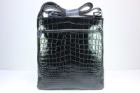 Плоская, вертикальная мужская плечевая сумка из брюха крокодила черного цвета. Ширина -28см, Высота-31см. Для пошива сумок данной модели используется натуральная кожа сиамского крокодила, нежнейшая брюшная часть. Кожа крокодила высокого качества выделки и окраса, кожа мягкая и упругая, и очень приятная на ощупь. Лицевая часть сумки выполнена с применением брюшной части крокодиловой шкуры. На лицевой поверхности сумки, в верхней части вшита металлическая молния преграждающая доступ в плоский карман. Обратная часть сумки выполнена из крокодиловой кожи брюшной части шкуры. В верхней части сумки вшит плечевой ремень. Несъёмный плечевой ремень с возможностью регулировки по длине прикреплен к сумке в верхней части. Плечевой ремень выполнен на основании из мягкой кожи теленка, в качестве дополнительного украшения сумки внешняя поверхность плечевого ремня имеет отделку крокодиловой кожей. В верхней части сумки вшита металлическая молния, молния преграждает доступ в основной объем сумки. Внутри сумка устроена в одном объеме. Для удобства пользования внутри сумки выполнены карманы для предметов первой необходимости: боковой карман на молнии и сдвоенный накладной карман. В качестве материала подклада сумки применена натуральная кожа теленка, цвет кожи теленка подобран под цвет кожи крокодила.