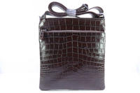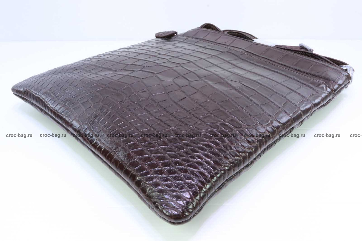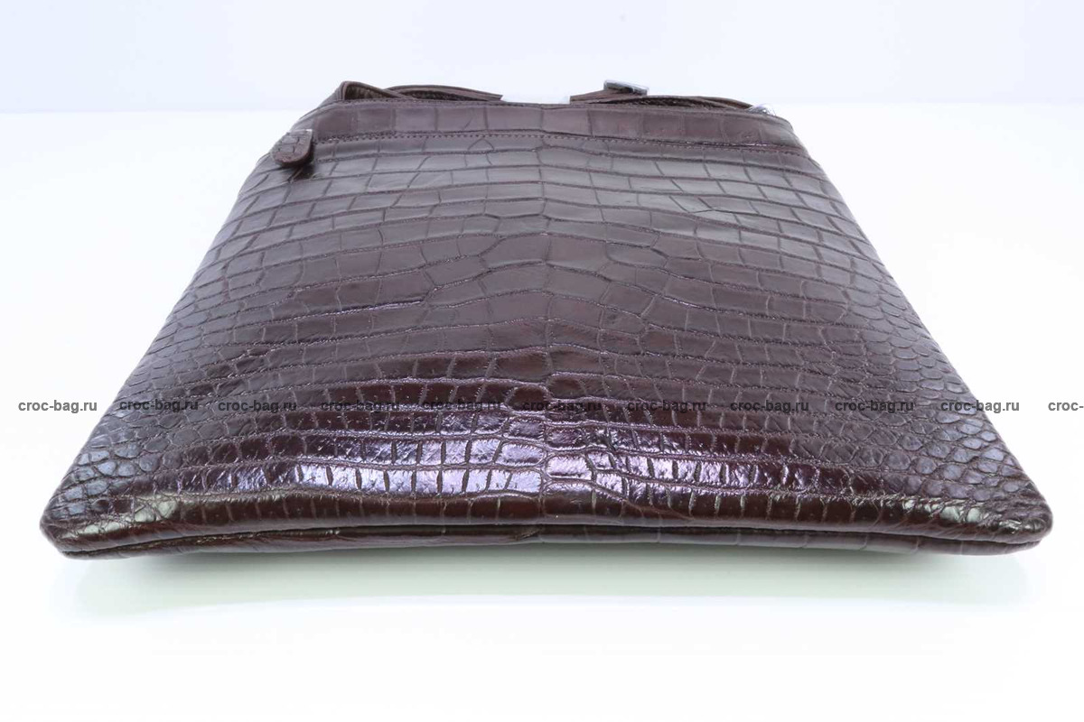 Плоская, вертикальная мужская плечевая сумка из брюха крокодила коричневого цвета. Ширина -28см, Высота-31см. Для пошива сумок данной модели используется натуральная кожа сиамского крокодила, нежнейшая брюшная часть. Кожа крокодила высокого качества выделки и окраса, кожа мягкая и упругая, и очень приятная на ощупь. Лицевая часть сумки выполнена с применением брюшной части крокодиловой шкуры. На лицевой поверхности сумки, в верхней части вшита металлическая молния преграждающая доступ в плоский карман. Обратная часть сумки выполнена из крокодиловой кожи брюшной части шкуры. В верхней части сумки вшит плечевой ремень. Несъёмный плечевой ремень с возможностью регулировки по длине прикреплен к сумке в верхней части. Плечевой ремень выполнен на основании из мягкой кожи теленка, в качестве дополнительного украшения сумки внешняя поверхность плечевого ремня имеет отделку крокодиловой кожей. В верхней части сумки вшита металлическая молния, молния преграждает доступ в основной объем сумки. Внутри сумка устроена в одном объеме. Для удобства пользования внутри сумки выполнен боковой карман на молнии. В качестве материала подклада сумки применена натуральная кожа теленка, цвет кожи теленка подобран под цвет кожи крокодила.