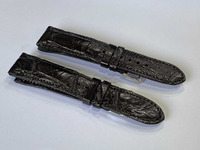 Ремешки для часов из натуральной кожи крокодила черного цвета размер 20х18мм длина длинного ремешка 115см и длинна кроткого ремешка 75мм. Для пошива ремешков для часов используется натуральная кожа молодого сиамского крокодила нежнейшая брюшная часть, крокодиловая кожа высокого качества выделки и окраса с полу-глянцевым финишным покрытием. Крокодиловые ремешки для часов выполнены на основании из кожи теленка. На ремешке имеется два колечка, на полотне ремешка пробиты отверстия. Ремешки находятся в Таиланде, на товары из Таиланда действует бесплатная доставка в Россию. Получив данный ремень вам останется лишь сменить данный ремень на своих часах самому или же обратится с этим в любую мастерскую по близости к вашему дому.