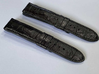 Ремешки для часов из натуральной кожи крокодила черного цвета размер 20х20мм длина длинного ремешка 115см и длинна кроткого ремешка 75мм. Для пошива ремешков для часов используется натуральная кожа молодого сиамского крокодила нежнейшая брюшная часть, крокодиловая кожа высокого качества выделки и окраса с полу-глянцевым финишным покрытием. Крокодиловые ремешки для часов выполнены на основании из кожи теленка. На ремешке имеется два колечка, на полотне ремешка пробиты отверстия. Ремешки находятся в Таиланде, на товары из Таиланда действует бесплатная доставка в Россию. Получив данный ремень вам останется лишь сменить данный ремень на своих часах самому или же обратится с этим в любую мастерскую по близости к вашему дому.