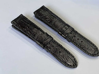 Ремешки для часов из натуральной кожи крокодила черного цвета размер 22х20мм длина длинного ремешка 115см и длинна кроткого ремешка 75мм. Для пошива ремешков для часов используется натуральная кожа молодого сиамского крокодила нежнейшая брюшная часть, крокодиловая кожа высокого качества выделки и окраса с полу-глянцевым финишным покрытием. Крокодиловые ремешки для часов выполнены на основании из кожи теленка. На ремешке имеется два колечка, на полотне ремешка пробиты отверстия. Ремешки находятся в Таиланде, на товары из Таиланда действует бесплатная доставка в Россию. Получив данный ремень вам останется лишь сменить данный ремень на своих часах самому или же обратится с этим в любую мастерскую по близости к вашему дому.
