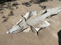 Шкура сиамского крокодила с натуральной крокодиловой головой и лапами цвет гималаи. Ширина крокодиловой шкуры – 74см длина шкуры крокодила примерно 230см. Довольно редкая и уникальная крокодиловая шкура, голова крокодила, череп практически в идеальном состоянии, кожа черепа цела и без явных повреждений. Наличествуют все крокодиловые зубы, по пожеланию заказчика могут быть вставлены пластиковые глаза. На шкуре в целости все четыре лапы, на передних лапах по пять пальцев, три из которых с натуральными когтями, на задних лапах по четыре пальца, каждый из которых с натуральными крокодиловыми когтями, размер крокодиловой головы ширина – 25 см, длина – 40см, высота крокодиловой головы – 15см. За крокодиловой головой расположен фактурный крокодиловый затылок, следом за крокодиловым затылком продолжается фактурная спинная часть рептилии, гармонично перетекающая в фактурный крокодиловый хвост. Также впечатляют размеры самой шкуры, ее ширина 74см, и длина 230см. На крокодиловой шкуре присутствуют небольшие дефекты, что вполне приемлемо для рептилии такого размера. Это декоративная шкура крокодила, которой можно украсить стенку в винном погребе, использовать на полу в качестве украшения интерьера, также прекрасная идея если эту крокодиловую шкуру размесить на круглую колонну, да и вообще очень необычная и в прямом смысле слова экзотическая идея для подарка если вы хотите впечатлить человека у которого почти все есть. В комплекте с данной шкурой поставляется сертификат международного образца, сертификат CITES, данный документ позволяет данной крокодиловой шкуре покинуть территорию Таиланда. В том случае если вы находитесь на территории Таиланда, будь то Паттайя, Пхукет, Самуи или Бангкок и хотите приобрести данную шкуру на территории страны улыбок, напишите нам, и мы пересчитаем для вас цену без учета стоимости доставки данной шкуры крокодила в Россию. Однако следует отметить 2 момента, не тяните до последнего дня, так как доставка, например, на Пхукет занимает 3, а иногда и 4 дня, а также нам нужно удостоверится в наличии у нас сертификата CITES и его датах. Сертификат CITES имеет срок годности 6 месяцев со дня его выпуска государственным регулирующим органом. В наличии на ферме есть еще несколько больших крокодиловых шкур с головой и лапами, в ближайшее время мы постараемся добавить эти большие шкуры на сайт. У нас также есть возможность подобрать крокодиловую шкуру с головой и лапами под нужный вам размер и выкрасить ее в требуемый цвет, будь то цвет гималаи или любой другой цвет или оттенок. За дополнительную плату вы можете заказать услугу по склеиванию передних и задних крокодиловых лап в одну плоскость, видео до и после будет приложено в ближайшее время. Такое склеивание делает площадь шкуры ровной и плавно перетекающей от подбородка, через переднюю лапу, на брюшную часть и через заднюю лапу на хвостовую часть.