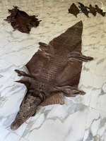 Шкура сиамского крокодила с натуральной крокодиловой головой и лапами цвет темно-коричневый. Ширина крокодиловой шкуры – 98см длина шкуры крокодила примерно 320см. Довольно редкая и уникальная крокодиловая шкура, на крокодиловой голове есть небольшие потертости кожи, наличествуют крокодиловые зубы, по пожеланию заказчика могут быть вставлены пластиковые глаза. На шкуре в целости все четыре лапы, на передних лапах по пять пальцев, три из которых с натуральными когтями, на задних лапах по четыре пальца, каждый из которых с натуральными крокодиловыми когтями, размер крокодиловой головы ширина – 25-30 см, длина – 40-50см, высота крокодиловой головы – 15-20см. За крокодиловой головой расположен фактурный крокодиловый затылок, следом за крокодиловым затылком продолжается фактурная спинная часть рептилии гармонично перетекающая в фактурный крокодиловый хвост. Также впечатляют размеры самой шкуры, ее ширина 98см, и длина 320см. На крокодиловой шкуре присутствуют небольшие дефекты, что вполне приемлемо для рептилии такого размера. Это декоративная шкура крокодила, которой можно украсить стенку в винном погребе, использовать на полу в качестве украшения интерьера, также прекрасная идея если эту крокодиловую шкуру размесить на круглую колонну, да и вообще очень необычная и в прямом смысле слова экзотическая идея для подарка если вы хотите впечатлить человека у которого почти все есть. В комплекте с данной шкурой поставляется сертификат международного образца, сертификат CITES, данный документ позволяет данной крокодиловой шкуре покинуть территорию Таиланда. В том случае если вы находитесь на территории Таиланда, будь то Паттайя, Пхукет, Самуи или Бангкок и хотите приобрести данную шкуру на территории страны улыбок, напишите нам, и мы пересчитаем для вас цену без учета стоимости доставки данной шкуры крокодила в Россию. Однако следует отметить 2 момента, не тяните до последнего дня, так как доставка, например, на Пхукет занимает 3, а иногда и 4 дня, а также нам нужно удостоверится в наличии у нас сертификата CITES и его датах. Сертификат CITES имеет срок годности 6 месяцев со дня его выпуска государственным регулирующим органом. В наличии на ферме есть еще несколько больших крокодиловых шкур с головой и лапами, в ближайшее время мы постараемся добавить эти большие шкуры на сайт. У нас также есть возможность подобрать крокодиловую шкуру с головой и лапами под нужный вам размер и выкрасить ее в требуемый цвет, будь то цвет гималаи или любой другой цвет или оттенок. За дополнительную плату вы можете заказать услугу по склеиванию передних и задних крокодиловых лап в одну плоскость, видео до и после будет приложено в ближайшее время. Такое склеивание делает площадь шкуры ровной и плавно перетекающей от подбородка, через переднюю лапу, на брюшную часть и через заднюю лапу на хвостовую часть.