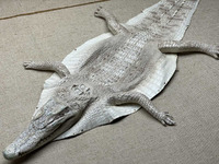 Шкура сиамского крокодила с головой и лапами ширина 33см, длина 130см, цвет гималаи, фактурная крокодиловая шкура с настоящей крокодилово головой и лапками. Натуральная крокодиловая голова (череп) покрытый крокодиловой кожей, крокодиловые челюсти с зубами. Передние и задние крокодиловые лапки с пальцами и когтями, лапки набиты синтепоном и имеют объемную форму, очень приятные на ощупь, мягкие и эластичные, всякий раз прикасаясь к крокодиловым лапкам вы будете получать поистине незабываемые приятные ощущения. Данная крокодиловая шкура отличный и незабываемый подарок, прекрасное украшение интерьера. В передней части крокодиловой шкуры устроена натуральная крокодиловая голова, следом за головой на шкуре расположена фактурная затылочная часть, далее в центральной части шкуры устроена спинная фактурная крокодиловая кожа, по бокам от этой центральной фактурной части расположено крокодиловое брюхо, следуя далее фактурная спинная часть переходит в хвост с неповторимой природной фактурой, сначала более крупной и по меру сужения хвоста, фактура становится все более мелкой.