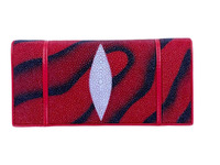 Кошелек портмоне из натуральной кожи морского ската красного цвета с полосками. Для пошива кошельков данной модели складного портмоне фабрика использует натуральную кожу морского ската, натуральную кожу теленка подобранную по цвету под цвет кожи морского ската и текстиль. Кошельком из кожи морского ската данной модели могут пользоваться как женщины, так и мужчины. Портмоне из кожи морского ската данной модели придется по вкусу тем из вас, кто отдает предпочтение вертикальным складным кошелькам среднего размера, с хорошим функционалом. Обе внешних части кошелька отшиты с применением натуральной кожи морского ската высокого качества выделки и окраса, лицевая сторона кошелька украшена белым ромбообразным глазком, кошелек правильной прямоугольной формы, закрывается на металлическую кнопку. Внутри кошелек состоит из: пяти отделений для карточек, одно из которых выполнено с прозрачным окошком, двумя плоскими кармашками, устроенными под слотом для карточек. Плоским карманом и кармашком на молнии. Плоский карман на молнии устроен между двумя отделениями для банкнот. Этот карман на молнии может быть использован и как монетница и как отделение для хранения мелких ценных предметов. Мягкая, натуральная кожа теленка под цвет кожи морского ската применена в качестве материала подклада, так же в качестве материала подклада используется текстиль.