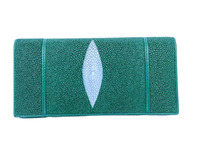 Кошелек портмоне из натуральной кожи морского ската темно-зеленого цвета. Для пошива кошельков данной модели складного портмоне фабрика использует натуральную кожу морского ската, натуральную кожу теленка подобранную по цвету под цвет кожи морского ската и текстиль. Кошельком из кожи морского ската данной модели могут пользоваться как женщины, так и мужчины. Портмоне из кожи морского ската данной модели придется по вкусу тем из вас, кто отдает предпочтение вертикальным складным кошелькам среднего размера, с хорошим функционалом. Обе внешних части кошелька отшиты с применением натуральной кожи морского ската высокого качества выделки и окраса, лицевая сторона кошелька украшена белым ромбообразным глазком, кошелек правильной прямоугольной формы, закрывается на металлическую кнопку. Внутри кошелек состоит из: пяти отделений для карточек, одно из которых выполнено с прозрачным окошком, двумя плоскими кармашками, устроенными под слотом для карточек. Плоским карманом и кармашком на молнии. Плоский карман на молнии устроен между двумя отделениями для банкнот. Этот карман на молнии может быть использован и как монетница и как отделение для хранения мелких ценных предметов. Мягкая, натуральная кожа теленка под цвет кожи морского ската применена в качестве материала подклада, так же в качестве материала подклада используется текстиль.