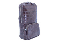 Слинг баг из натуральной кожи сиамского крокодила темно-коричневого цвета. Для пошива сумок данной модели фабрика использует натуральную кожу сиамского крокодила, брюшную часть. Крокодиловая кожа высокого качества выделки и окраса с неповторимым природным рисунком крокодилового брюха. Сумка вертикальная, прямоугольной формы, на лицевой стороне сумки в нижней ее части устроен удобный объемный накладной карман, высота кармана 11см, толщина этого кармана 2,5см. В верхней части сумки вшита металлическая молния преграждающая доступ в основной объем сумки. Молния заведена на боковые поверхности сумки, что позволяет получить более удобный доступ в основной объем сумки. Все внешние детали и поверхности сумки отшиты из натуральной брюшной части кожи крокодила. В верхней части сумки выполнено крепление плечевого ремня, плечевой ремень шириной 28мм, что довольно удобно, когда плечевой ремень широкий, кожа теленка используется как основание для плечевого ремня, лицевая часть плечевого ремня украшена накладкой из кожи крокодила, плечевой ремень регулируется по длине. На обратной стороне сумки в нижней части расположены два металлических кольца, по одному с каждой стороны сумки, это позволяет перестегнуть плечевой ремень на более удобную для вас сторону. Основной объем сумки имеет толщину 6см, сумка внутри выполнена в одном объеме, для удобства пользования данной сумкой внутри выполнен плоский накладной карман. Мягкая кожа теленка в темно-коричневом цвета используется как материал подклада. Сумки данной модели отшиваются в классических мужских цвета таких как черный, темно-коричневый реже в темно синем и темно-зеленом цветах по фактуре это может быть брюхо сиамского крокодила или спинная его часть.