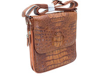 Сумка мужская плечевая из натуральной кожи крокодила светло-коричневого цвета. Если вас заинтересовала данная сумка вы хотели бы уточнить ее цену или наличие в других цветах, свяжитесь с нами, возможно мы подберем вам более бюджетный вариант плечевой крокодиловой сумки или найдем сумку данной модели в другом цвете, не исключён вариант индивидуального пошива данной сумки. Высококачественная кожа крокодилового каймана используется фабрикой для пошива сумок данной модели. Сумка классической прямоугольной формы, на лицевой части сумки устроен откидывающийся вверх лицевой клапан, клапан украшен кожей крокодила кайман с фактурным затылком, переходящим в спинную часть. Лицевая поверхность ниже лицевого клапана выполнена с применением крокодиловой кожи со спинной фактурой. Обратная сторона сумки украшена крокодиловой кожей с фактурной спинной частью, переходящей в хвостовую. Для придания сумке большей эластичности боковые вставки сумки выполнены из кожи теленка под цвет кожи крокодила. Также на боковых поверхностях сумки устроены металлические молнии, расстегнув которые можно увеличить вместимость сумки. В верхней части сумки вшиты металлические кольца к которым прикреплен плечевой ремень. Несъемный плечевой ремень из кожи теленка с отделкой внешней части ремня кожей крокодила имеет возможность регулировки по длине. Лицевой клапан фиксируется к сумке на лицевой поверхности на вшитые магниты. Внутри сумки на лицевой поверхности под клапаном устроено два плоский кармана выполненных на всю ширину сумки. Под лицевым клапаном в верху сумки выполнен доступ в основной объем сумки, сумка устроена из двух независимых отделений, между двух отделений устроен плоский карман. В одном из отделений устроен сдвоенный накладной карман плоский и объемный, в другом отделении выполнен вшивной карман на молнии. Натуральная, мягкая кожа теленка, подобранная по цвету под кожу крокодила используется в данной крокодиловой сумке в качестве материала подклада. Отдельно следует отметить что данная модель мужской плечевой сумки является одной из популярных и отшивается как в различной крокодиловой коже, в спинной части и брюшной части, в различных цветах, правда в основном в мужских цветах таких как черный, коричневые цвета, реже в темно синем и темно зеленом, встречается и в сером цвете. Также сумка данной модели отшивается с небольшими изменениями по внешнему виду и по размерам. Свяжитесь с нами если у вас появились вопросы по данной сумке.