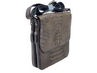 Сумка мужская плечевая из натуральной кожи крокодила темно-коричневого цвета. Если вас заинтересовала данная сумка вы хотели бы уточнить ее цену или наличие в других цветах, свяжитесь с нами, возможно мы подберем вам более бюджетный вариант плечевой крокодиловой сумки или найдем сумку данной модели в другом цвете, не исключён вариант индивидуального пошива данной сумки. Высококачественная кожа крокодилового каймана используется фабрикой для пошива сумок данной модели. Сумка классической прямоугольной формы, на лицевой части сумки устроен откидывающийся вверх лицевой клапан, клапан украшен кожей крокодила кайман с фактурным затылком, переходящим в спинную часть. Лицевая поверхность ниже лицевого клапана выполнена с применением крокодиловой кожи со спинной фактурой. Обратная сторона сумки украшена крокодиловой кожей с фактурной спинной частью, переходящей в хвостовую. Для придания сумке большей эластичности боковые вставки сумки выполнены из кожи теленка под цвет кожи крокодила. Также на боковых поверхностях сумки устроены металлические молнии, расстегнув которые можно увеличить вместимость сумки. В верхней части сумки вшиты металлические кольца к которым прикреплен плечевой ремень. Несъемный плечевой ремень из кожи теленка с отделкой внешней части ремня кожей крокодила имеет возможность регулировки по длине. Лицевой клапан фиксируется к сумке на лицевой поверхности на вшитые магниты. Внутри сумки на лицевой поверхности под клапаном устроено два плоский кармана выполненных на всю ширину сумки. Под лицевым клапаном в верху сумки выполнен доступ в основной объем сумки, сумка устроена из двух независимых отделений, между двух отделений устроен плоский карман. В одном из отделений устроен сдвоенный накладной карман плоский и объемный, в другом отделении выполнен вшивной карман на молнии. Натуральная, мягкая кожа теленка, подобранная по цвету под кожу крокодила используется в данной крокодиловой сумке в качестве материала подклада. Отдельно следует отметить что данная модель мужской плечевой сумки является одной из популярных и отшивается как в различной крокодиловой коже, в спинной части и брюшной части, в различных цветах, правда в основном в мужских цветах таких как черный, коричневые цвета, реже в темно синем и темно зеленом, встречается и в сером цвете. Также сумка данной модели отшивается с небольшими изменениями по внешнему виду и по размерам. Свяжитесь с нами если у вас появились вопросы по данной сумке.