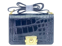 Женская сумка из натуральной кожи крокодила, крокодиловое брюхо черного цвета. Для пошива женских сумок данной модели используется крокодиловое брюхо, высокого качества выделки и окраса. Сумки из кожи рептилии данной модели придутся по вкусу тем из вас кто отдает свое предпочтение плечевым сумкам небольшого размера. Сумка правильной прямоугольной формы, с немного скругленными уголками, с лицевым клапаном, длинной плечевой цепочкой. Все внешние поверхности сумки такие как: лицевой клапан, поверхность под лицевым клапаном, обратная поверхность сумки, боковые вставки и дно выполнены с применением брюшной и гладких частей кожи рептилии. В верхней части сумки расположены металлические кольца к которым прикреплен плечевой ремень выполненный кожи теленка с отделкой внешней поверхности ремня кожей крокодила, плечевой ремень имеет возможность регулировки по длине. Внутри сумка выполнена в одном объеме, внутри сумки сделан плоский накладной карман. Натуральная, мягкая кожа теленка, подобранная по цвету под цвет крокодиловой кожи используется в качестве материала подклада в данных крокодиловых сумках. Женские сумки данной модели отшиваются из натурального крокодилового брюха в различных цветах. Свяжитесь с нами если у вас появились вопросы или вы хотите купить данную женскую крокодиловую сумку.
