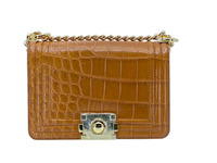 Женская сумка из натуральной кожи крокодила, крокодиловое брюхо светло-коричневого, коньячного цвета. Для пошива женских сумок данной модели используется крокодиловое брюхо, высокого качества выделки и окраса. Сумки из кожи рептилии данной модели придутся по вкусу тем из вас кто отдает свое предпочтение плечевым сумкам небольшого размера. Сумка правильной прямоугольной формы, с немного скругленными уголками, с лицевым клапаном, длинной плечевой цепочкой. Все внешние поверхности сумки такие как: лицевой клапан, поверхность под лицевым клапаном, обратная поверхность сумки, боковые вставки и дно выполнены с применением брюшной и гладких частей кожи рептилии. В верхней части сумки расположены металлические кольца к которым прикреплен плечевой ремень выполненный в виде цепочки с крупными звеньями. Верхняя центральная часть плечевого ремня выполнена из крокодиловой кожи, плечевой ремень имеет возможность регулировки по длине. Внутри сумка выполнена в одном объеме, внутри сумки сделан плоский накладной карман. Натуральная, мягкая кожа теленка, подобранная по цвету под цвет крокодиловой кожи используется в качестве материала подклада в данных крокодиловых сумках. Женские сумки данной модели отшиваются из натурального крокодилового брюха в различных цветах. Свяжитесь с нами если у вас появились вопросы или вы хотите купить данную женскую крокодиловую сумку.