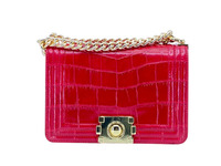 Женская сумка из натуральной кожи крокодила, крокодиловое брюхо красного цвета. Для пошива женских сумок данной модели используется крокодиловое брюхо, высокого качества выделки и окраса. Сумки из кожи рептилии данной модели придутся по вкусу тем из вас кто отдает свое предпочтение плечевым сумкам небольшого размера. Сумка правильной прямоугольной формы, с немного скругленными уголками, с лицевым клапаном, длинной плечевой цепочкой. Все внешние поверхности сумки такие как: лицевой клапан, поверхность под лицевым клапаном, обратная поверхность сумки, боковые вставки и дно выполнены с применением брюшной и гладких частей кожи рептилии. В верхней части сумки расположены металлические кольца к которым прикреплен плечевой ремень выполненный в виде цепочки с крупными звеньями. Верхняя центральная часть плечевого ремня выполнена из крокодиловой кожи, плечевой ремень имеет возможность регулировки по длине. Внутри сумка выполнена в одном объеме, внутри сумки сделан плоский накладной карман. Натуральная, мягкая кожа теленка, подобранная по цвету под цвет крокодиловой кожи используется в качестве материала подклада в данных крокодиловых сумках. Женские сумки данной модели отшиваются из натурального крокодилового брюха в различных цветах. Свяжитесь с нами если у вас появились вопросы или вы хотите купить данную женскую крокодиловую сумку.