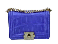 Женская сумка из натуральной кожи крокодила, крокодиловое брюхо фиолетово-синего цвета. Для пошива женских сумок данной модели используется крокодиловое брюхо, высокого качества выделки и окраса. Сумки из кожи рептилии данной модели придутся по вкусу тем из вас кто отдает свое предпочтение плечевым сумкам небольшого размера. Сумка правильной прямоугольной формы, с немного скругленными уголками, с лицевым клапаном, длинной плечевой цепочкой. Все внешние поверхности сумки такие как: лицевой клапан, поверхность под лицевым клапаном, обратная поверхность сумки, боковые вставки и дно выполнены с применением брюшной и гладких частей кожи рептилии. В верхней части сумки расположены металлические кольца к которым прикреплен плечевой ремень выполненный в виде цепочки с крупными звеньями. Верхняя центральная часть плечевого ремня выполнена из крокодиловой кожи, плечевой ремень имеет возможность регулировки по длине. Внутри сумка выполнена в одном объеме, внутри сумки сделан плоский накладной карман. Натуральная, мягкая кожа теленка, подобранная по цвету под цвет крокодиловой кожи используется в качестве материала подклада в данных крокодиловых сумках. Женские сумки данной модели отшиваются из натурального крокодилового брюха в различных цветах. Свяжитесь с нами если у вас появились вопросы или вы хотите купить данную женскую крокодиловую сумку.