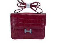 Женская сумка из натуральной брюшной части крокодиловой кожи винного цвета. Для пошива сумок данной модели фабрика использует натуральную кожу сиамского крокодила, брюшная часть рептилии. Сумка классической прямоугольной формы. Лицевой клапан отшит из натуральной крокодиловой кожи и фиксируется к сумке на магнитную защелку в форме буквы «H». В верхней части клапана выполнено крепление плечевого ремня, ремень из кожи теленка с отделкой лицевой части крокодиловой кожей, крепление плечевого ремня выполнено с применением пары металлических скобочек. Обратная сторона сумки отшита из крокодиловой кожи, лицевая поверхность сумки под лицевым клапаном выполнена из крокодиловой кожи, боковые вставки сумки выполнены из натуральной кожи крокодила, дно сумки также выполнено из кожи рептилии. Плоская стенка делит внутренний объем сумки на два отделения, внутри одного из отделений устроен плоский карман на молнии, натуральная кожа телёнка используется в качестве материала подклада данной женской сумки.