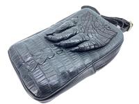Компактная плечевая сумка из комбинированной кожи. Для изготовления сумок данной модели используются спинно-хвостовые части шкур сиамского крокодила, натуральная лапа сиамского крокодила с когтями, и кожа теленка черного цвета. Кожа высокого качества выделки. В качестве основного украшения сумки на лицевой ее части расположена натуральная крокодилова лапа с когтями. Лицевая часть сумки выполнена их кожи крокодила с хвостовой фактурой. Боковые части сумки, обратная сторона и дно выполнены в коже теленка черного цвета. В верхней части сумки вшита металлическая молния. Сумка оборудована несъемным плечевым ремнем. Ремень выполнен из нейлоновой ленты с лицевой отделкой крокодиловой кожей. Внутри сумка одно-объёмная, устроено два кармана, накладной и плоский на молнии. В качестве материала подклада использована мягкая ткань.