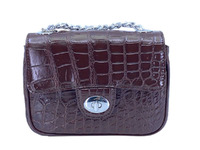 Женская сумка стиле Chanel из кожи крокодила темно-коричневого цвета. При изготовлении сумок данной модели используется натуральная кожа сиамского крокодила, нежнейшая брюшная часть с неповторимым природным рисунком, кожа высшего сорта, очень приятная на ощупь, высокого качества выделки и окраса. Сумки данной модели приглянутся тем из вас кому нравятся сумки в стиле Chanel, не копии, а именно что сумки, выполненные в стиле Chanel, компактные и удобные. Сумка прямоугольной формы, лицевой клапан округлой формы, с округленными краями закрывается на поворотную застежку, устроенную в нижней части клапана, на обратной стороне сумки устроен небольшой накладной плоский кармашек. Лицевой клапан, обратная сторона сумки, и лицевая поверхность ниже лицевого клапана выполнены из кожи крокодила. Боковые поверхности и дно сумки также отшиты из кожи крокодила. В верхней части клапана устроены металлические люверсы через которые пропущен плечевой ремешок в виде металлической цепочки. Звенья металлической цепочки оплетены кожаным шнурком. На лицевой поверхности сумки, под лицевым клапаном выполнен плоский карман. В верхней части сумки под лицевым клапаном устроен доступ в основной объем сумки, сумка внутри отшита в одном объеме, для удобства пользования, внутри сумки выполнен плоский карман на молнии. Мягкая, натуральная кожа теленка темно-коричневого цвета применена в качестве материала подклада сумки. Свяжитесь с нами, если у вас есть вопросы по этой сумке или вы хотите приобрести сумку данной модели в ином цвете, мы проверим наличие сумок в другом цвете на складе фабрики или даже можно заказать отшить данную сумку в вашем любимом цвете.