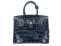 Женская сумка в стиле Hermès Birkin из натурального брюха сиамского крокодила черного цвета с фурнитурой серебряного цвета. Для пошива этих сумок фабрика использует натуральную брюшную часть крокодилового брюха с неповторимым узором кожи крокодила. Сумка отшита по мотивам одной из самых популярных в мире женских сумок Hermès Birkin 25. Декоративный ремешок из крокодиловой увенчанный замочком обернутым крокодиловой кожей украшает лицевую часть сумки, к одной из ручек прикреплен шнурок из кожи крокодила в нижней части шнурка размещен ключик открывающий замочек на лицевой части сумки. В верхней части сумки устроены удобные ручки, выполненные из кожи крокодила. На ручках крокодила есть фиксирующее ручки кольцо из крокодиловой кожи. Лицевая часть, клапан на лицевой части, обратная сторона сумки, боковые поверхности и дно сумки выполнены из натуральной крокодиловой кожи, из брюха рептилии. На боковых поверхностях расположены кольца для крепления съемного плечевого ремня. Плечевой ремень с регулировкой по длине изготовленный из кожи теленка с отделкой внешней поверхности крокодиловой кожей идет в комплекте с сумкой. Сумка внутри выполнены в одном объеме, для удобства пользования сумкой внутри устроены карманы боковой на молнии и накладной плоский карман. Мягкая, натуральная кожа теленка используете в качестве материала подклада. Сумки данной модели отшиваются фабрикой довольно часто и в различных цветах и размерах, свяжитесь с нами если у вас появились вопросы про женскую сумку из кожи рептилии в стиле Hermès Birkin.