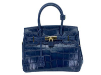 Женская сумка в стиле Hermès Birkin из натурального брюха сиамского крокодила темно-синего цвета с фурнитурой серебряного цвета. Для пошива этих сумок фабрика использует натуральную брюшную часть крокодилового брюха с неповторимым узором кожи крокодила. Сумка отшита по мотивам одной из самых популярных в мире женских сумок Hermès Birkin 25. Декоративный ремешок из крокодиловой увенчанный замочком обернутым крокодиловой кожей украшает лицевую часть сумки, к одной из ручек прикреплен шнурок из кожи крокодила в нижней части шнурка размещен ключик открывающий замочек на лицевой части сумки. В верхней части сумки устроены удобные ручки, выполненные из кожи крокодила. На ручках крокодила есть фиксирующее ручки кольцо из крокодиловой кожи. Лицевая часть, клапан на лицевой части, обратная сторона сумки, боковые поверхности и дно сумки выполнены из натуральной крокодиловой кожи, из брюха рептилии. На боковых поверхностях расположены кольца для крепления съемного плечевого ремня. Плечевой ремень с регулировкой по длине изготовленный из кожи теленка с отделкой внешней поверхности крокодиловой кожей идет в комплекте с сумкой. Сумка внутри выполнены в одном объеме, для удобства пользования сумкой внутри устроены карманы боковой на молнии и накладной плоский карман. Мягкая, натуральная кожа теленка используете в качестве материала подклада. Сумки данной модели отшиваются фабрикой довольно часто и в различных цветах и размерах, свяжитесь с нами если у вас появились вопросы про женскую сумку из кожи рептилии в стиле Hermès Birkin.