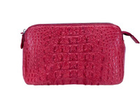 Женская сумка клатч из натуральной фактурной кожи крокодила красного цвета. Для пошива сумок данной модели фабрика использует натуральную кожу сиамского крокодила, фактурная крокодиловая спина. Сумка клатч данной модели не имеют ярко выраженной лицевой или обратной стороны. Обе из сторон сумки выполнены с применением фактурной кожи рептилии. Боковые вставки, дно и вставки в верхней внутренней части сумки выполнены из кожи крокодила. Дно сумки оборудовано металлическими ножками. На боковых поверхностях клатча устроены металлические кольца к которым крепится съемный плечевой ремень. Сумка состоит из двух независимых отделений каждое из которых закрывается на металлическую молнию и еще одного центрального кармашка на молнии устроенного между основными объемами сумки. Внутри основных отделений устроены плоские карманы и карман на молнии. Мягкая кожа теленка спилок применена в качестве материала подклада. Плечевой ремень с регулировкой по длине поставляется в комплекте, ремень выполнен на из кожи теленка внешняя часть ремня отделана кожей крокодила.