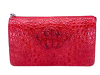 Женская сумка клатч из натуральной фактурной кожи крокодила красного цвета. Для пошива сумок данной модели фабрика использует натуральную кожу сиамского крокодила, фактурная крокодиловая спина. Клатч классической прямоугольной формы, в верхней части клатча выполнена металлическая молния. Сумка клатч данной модели может использоваться и как ручной клатч и как маленькая плечевая сумка. Лицевая часть данного клатча украшена кожей рептилии с крупной затылочной частью. Обратная сторона украшена кожей крокодила со спинной фактурой, на обратной стороне клатча устроена металлическая молния преграждающая доступ в плоский карман. Для приданию клатчу большей эластичности боковые поверхности и дно выполнены из натуральной кожи теленка красного цвета, на боковых поверхностях расположены металлические кольца к которым при необходимости крепится съемный плечевой ремень. Плечевой ремень идет в комплекте с данным клатчем. Клатч внутри устроен очень интересным образом, внутри по центру клатча устроено объемное отделение на металлической молнии. Слева и справа от этого центрального объемного кармана выполнено два открытых отделения. В открытых отделениях выполнены карманы для карточек, плоские широкие карманы и боковой карман на молнии. Между центральным отделением на молнии и боковыми отделениями выполнено два плоских кармашка, по одному с каждой стороны. Мягкая, нежная, натуральная кожа теленка красного цвета используется в данном клатче из кожи рептилии в качестве материала подклада.