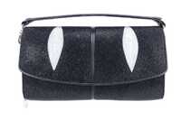 Популярная модель женской сумки клатча отшитая в натуральной коже морского ската. Сумка правильной прямоугольной формы, с откидывающимся вверх лицевым клапаном. Лицевой клапан изготовлен из натуральной кожи морского ската, в качестве украшения на лицевом клапане расположены белые глазки, это центральная часть шкуры морского ската. В нижней части сумки лицевой клапан фиксируется на металлическую магнитную кнопку. Обратная часть сумки клатча выполнена из кожи морского ската. На обратной части сумки из ската расположен удобный плоский карман с доступом в верхней части, карман устроен на всю ширину клатча из кожи ската. Под лицевым клапаном находится основной объем сумки состоящий из нескольких отделений. Отделения для предметов первой необходимости такие как мобильный телефон, ключи, документы и отделения на молнии предназначенного для банкнот или иных любых мелких ценных предметов. Внутри сумка выполнена из кожи теленка и ткани. Сумка из кожи морского ската оборудована верхней съемной ручкой. Верхняя поверхность съемной ручки выполнена из кожи морского ската. Также клатч оборудован съемный регулируемым по длине плечевым ремешком. В зависимости от ваших предпочтений, данное изделие можно носить и в руке, и на плече. Плечевой ремешок для сумки из кожи ската выполнен из кожи теленка. Данные клатчи являются довольно популярной моделью, можно сказать классической и изготавливаются из кожи морского скат в различных цветах, так и в крокодиловой коже различных фактур кожи и цветов крокодиловой кожи.