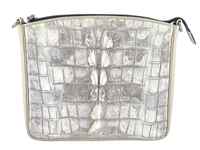 Сумка из комбинированной кожи, В качестве основного украшения лицевая поверхность сумки выполнена из крокодиловой кожи с фактурной хвостовой частью, боковые части сумки, дно и обратная сторона сумки выполнены из натуральной кожи теленка, подобранного под цвет крокодиловой кожи. На обратной стороне сумки устроен удобный карман на молнии. В верхней часть сумки вшита металлическая молния преграждающая доступ в основной объем сумки. На боковых поверхностях сумки устроены D-образные кольца для крепления съемного плечевого ремня. Съемный плечевой ремень, с возможностью регулировки по длине идет в комплекте с сумкой, минимальное расстояние от верха сумки до плечевого ремня 43см, максимальное расстояние от верха сумки до плечевого ремня 80см. Такой диапазон регулировки позволяет удобно пользоваться данной сумкой в любое из времен года. Плечевой ремень выполнен из нейлоновой ленты, верхняя поверхность плечевого ремня имеет отделку крокодиловой кожей. Внутри сумка выполнена в одном объеме, на боковых поверхностях устроены удобные карманы, вшивной на молнии и на противоположно стороне накладной карман, верхняя часть накладного кармана имеет отделку кожей теленка. В качестве материала подклада использована мягкая ткань песочного цвета.
