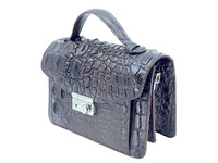 Мужска крокодиловая сумка-барсетка темно-коричневого цвета. Для пошива сумок данной модели фабрика использует натуральную кожу сиамского крокодила, фактурная спинная часть крокодиловой кожи, переходящая в брюшную часть крокодиловой шкуры. Кожа высокого качества выделки. Сумка-барсетка прямоугольной формы, в верхней части сумки устроена удобная верхняя ручка. Расстояние от верха сумки до ручки -6см. Верхняя ручка выполнена на основании из натуральной кожи теленка, верхняя часть ручки имеет отделку крокодиловой кожей. На лицевой поверхности сумки устроен откидывающийся вверх лицевой клапан, в нижней части клапан крепится к сумке на металлический замок. На обратной части крокодиловой сумки-барсетки устроен удобный плоский карман. На лицевой части сумки, под лицевым клапаном устроен накладной объемный карман. Отличительной особенностью данной крокодиловой сумки является то, что боковые поверхности сумки и дно сумки выполнены их гладких частей крокодиловой кожи, чего обычно не делают на сумках барсетках, обычно, на барсетках боковые вставки и дно выполняются из натуральной кожи теленка для придания барсеткам и портфелям большей эластичности. Внутри сумка барсетка выполнена из двух независимых отделений, между двух внутренних отделений устроен плоский карман на металлической молнии. Внутри сумки устроен накладной карман на молнии. В качестве материала подклада данной сумки-барсетки используется натуральная кожа теленка, спилок подобранная по цвету под цвет крокодиловой кожи. На внешних боковых поверхностях сумки устроены металлические кольца для крепления съемного плечевого ремня. Съемный плечевой ремень регулируемый по длине поставляется в комплекте с сумкой-барсеткой. Плечевой ремень выполнен на основании из натуральной кожи теленка, внешняя часть плечевого ремня имеет отделку крокодиловой кожей.