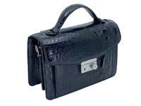 Мужска крокодиловая сумка-барсетка черного цвета. Для пошива сумок данной модели фабрика использует натуральную кожу сиамского крокодила, фактурная спинная часть крокодиловой кожи, переходящая в брюшную часть крокодиловой шкуры. Кожа высокого качества выделки. Сумка-барсетка прямоугольной формы, в верхней части сумки устроена удобная верхняя ручка. Расстояние от верха сумки до ручки -6см. Верхняя ручка выполнена на основании из натуральной кожи теленка, верхняя часть ручки имеет отделку крокодиловой кожей. На лицевой поверхности сумки устроен откидывающийся вверх лицевой клапан, в нижней части клапан крепится к сумке на металлический замок. На обратной части крокодиловой сумки-барсетки устроен удобный плоский карман. На лицевой части сумки, под лицевым клапаном устроен накладной объемный карман. Отличительной особенностью данной крокодиловой сумки является то, что боковые поверхности сумки и дно сумки выполнены их гладких частей крокодиловой кожи, чего обычно не делают на сумках барсетках, обычно, на барсетках боковые вставки и дно выполняются из натуральной кожи теленка для придания барсеткам и портфелям большей эластичности. Внутри сумка барсетка выполнена из двух независимых отделений, между двух внутренних отделений устроен плоский карман на металлической молнии. Внутри сумки устроен накладной карман на молнии. В качестве материала подклада данной сумки-барсетки используется натуральная кожа теленка, спилок подобранная по цвету под цвет крокодиловой кожи. На внешних боковых поверхностях сумки устроены металлические кольца для крепления съемного плечевого ремня. Съемный плечевой ремень регулируемый по длине поставляется в комплекте с сумкой-барсеткой. Плечевой ремень выполнен на основании из натуральной кожи теленка, внешняя часть плечевого ремня имеет отделку крокодиловой кожей.