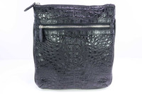 Плоская мужская плечевая сумка из натуральной крокодиловой кожи черного цвета, стандартная модель. Размеры: Ширина- 25см. Высота-27см. Толщина 2см. Удобная мужская плечевая крокодиловая сумка стандартного размера. Для пошива плечевых сумок данной модели используется натуральная крокодиловая кожа со спинной фактурой. А лицевой поверхности сумки мы видим фактурный крокодиловый затылок, переходящий ниже в спинную фактуру крокодиловой кожи. На обратной стороне сумки применена крокодиловая кожа со спинно-хвостовой фактурой крокодиловой шкуры. Сумка плоская и не имеет боковых поверхностей. Для удобства пользования крокодиловой сумкой на лицевой поверхности устроен вшивной карман на молнии, карман выполнен практически на всю ширину сумки. На обратной поверхности сумки расположены кольца для крепления несъемного плечевого ремня. Несъемный плечевой ремень, с возможностью регулировки по длине фактически пришит к сумке. Плечевой ремень выполнен на основании из натуральной кожи теленка и имеет отделку лицевой части крокодиловой кожей. В верхней части сумки вшита металлическая молния преграждающая доступ в основной объем крокодиловой сумки. Сумка внутри выполнена в одном объеме, для дополнительного удобства пользования внутри сумки устроены карманы сдвоенный накладной карман и вшивной боковой карман на молнии. В качестве материала подклада использована мягкая кожа теленка, цвет кожи теленка подобран по цвету под цвет кожи крокодила.