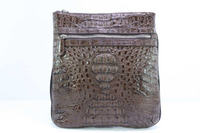 Плоская мужская плечевая сумка из натуральной крокодиловой кожи темно-коричневого, кофейного цвета, модель увеличенного размера. Размеры: Ширина- 27см. Высота-30см. Толщина 2см. Удобная мужская плечевая крокодиловая сумка увеличенного размера. Для пошива плечевых сумок данной модели используется натуральная крокодиловая кожа со спинной фактурой. А лицевой поверхности сумки мы видим фактурный крокодиловый затылок, переходящий ниже в спинную фактуру крокодиловой кожи. На обратной стороне сумки применена крокодиловая кожа со спинно-хвостовой фактурой крокодиловой шкуры. Сумка плоская и не имеет боковых поверхностей. Для удобства пользования крокодиловой сумкой на лицевой поверхности устроен вшивной карман на молнии, карман выполнен практически на всю ширину сумки. На обратной поверхности сумки расположены кольца для крепления несъемного плечевого ремня. Несъемный плечевой ремень, с возможностью регулировки по длине фактически пришит к сумке. Плечевой ремень выполнен на основании из натуральной кожи теленка и имеет отделку лицевой части крокодиловой кожей. В верхней части сумки вшита металлическая молния преграждающая доступ в основной объем крокодиловой сумки. Сумка внутри выполнена в одном объеме, для дополнительного удобства пользования внутри сумки устроены карманы сдвоенный накладной карман и вшивной боковой карман на молнии. В качестве материала подклада использована мягкая кожа теленка, цвет кожи теленка подобран по цвету под цвет кожи крокодила.