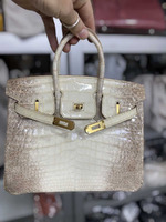 Женская сумка стиле Hermès BIRKIN 25 из глазурованной кожи сиамского крокодила, красивейшая брюшная часть первосортного крокодила цвета гималаи Himalaya. Сумка отшита в стиле Hermès BIRKIN размер сумки 25. Лицевая часть сумки и обратная сторона выполнены из натуральной кожи крокодила, брюшная часть, боковые поверхности сумки также выполнены из крокодиловой кожи, дно сумки отшито из кожи крокодила, дно оборудовано металлическими ножками. Фурнитура данной сумки выполнена в золотом цвете. В верхней части сумки устроены удобные ручки из кожи крокодила. Лицевая часть сумки украшена ремешком увенчанным металлическим замочком. На передней ручке, прикреплен шнурок из крокодиловой кожи, в нижней части шнурка расположен ключик для открытия замка. Натуральная кожа теленка применена в качестве материала подклада. Сумки данной модели стиле Hermès BIRKIN отшиваются фабрикой в различных цветах глазурованной кожи и различных размеров, 30 и 25.