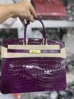 Женская сумка стиле Hermès BIRKIN 30 из глазурованной кожи сиамского крокодила, красивейшая брюшная часть первосортного крокодила фиолетового цвета. Сумка отшита в стиле Hermès BIRKIN размер сумки 30. Лицевая часть сумки и обратная сторона выполнены из натуральной кожи крокодила, брюшная часть, боковые поверхности сумки также выполнены из крокодиловой кожи, дно сумки отшито из кожи крокодила, дно оборудовано металлическими ножками. Фурнитура данной сумки выполнена в золотом цвете. В верхней части сумки устроены удобные ручки из кожи крокодила. Лицевая часть сумки украшена ремешком увенчанным металлическим замочком. На передней ручке, прикреплен шнурок из крокодиловой кожи, в нижней части шнурка расположен ключик для открытия замка. Натуральная кожа теленка применена в качестве материала подклада. Сумки данной модели стиле Hermès BIRKIN отшиваются фабрикой в различных цветах глазурованной кожи и различных размеров, 30 и 25.