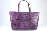 Классическая женская сумка размера А4 из натуральной фактурной крокодиловой кожи фиолетового цвета. Ширина в верхней части-46см, ширина в нижней части-36см, высота- 26см, толщина-14-15см. Отдельно необходимо отметить что сумка данной модели не укомплектована плечевым ремешком, а конструкция сумки на предусматривает D-образных хромированных колец для крепления плечевого ремня. Сумку данной модели можно носить как в руке, так на предплечье и возможно на плече. Сумка классической трапециевидной формы с ощутимым расширением к верху сумки. Все внешние поверхности сумки выполнены с применением крокодиловой кожи, лицевая часть сумки украшена крупной затылочной часть шкуры крокодила, обратная часть сумки украшена кожей крокодила с фактурой крокодиловой спины. Боковые поверхности сумки отшиты из фактурных хвостовых частей крокодиловой кожи. Удлинённые верхние ручки сумки выполнены из крокодиловой кожи. Крепление ручек сумки выполнена внакладку в верхней части лицевой и обратной части сумки. В верхней части сумки вшита металлическая молния преграждающая доступ в основной объем сумки. Плоский карман на молнии делит внутренний объем сумки на два кармана. Для удобства пользования сумкой, на внутренних поверхностях сумки расположены удобные карманы для предметов первой необходимости, сдвоенный накладной объемный кармана и боковой вшивной карман на молнии. В качестве дополнительного украшения, под карманом на молнии вшита декоративная полоска из крокодиловой кожи. В качестве материала подклада используется натуральная мягкая кожа теленка. Кожа теленка по цвету подобрана под цвет наружной кожи крокодила. Дно сумки отшито из натуральной кожи теленка, кожа теленка по цвету подобрана под цвет крокодиловой кожи. Крокодиловые сумки данной модели являются довольно удачными и популярными, сумки данной модели отшивают в коже крокодила как из фактурной кожи крокодила, так и из брюшной части крокодиловых шкур. И естественно фабрики отшивают сумки данной модели в различных цветовых решениях, не только в классических, но и в довольно ярких цветах.