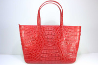 Классическая женская сумка размера А4 из натуральной фактурной крокодиловой кожи красного цвета. Ширина в верхней части-46см, ширина в нижней части-36см, высота- 26см, толщина-14-15см. Отдельно необходимо отметить что сумка данной модели не укомплектована плечевым ремешком, а конструкция сумки на предусматривает D-образных хромированных колец для крепления плечевого ремня. Сумку данной модели можно носить как в руке, так на предплечье и возможно на плече. Сумка классической трапециевидной формы с ощутимым расширением к верху сумки. Все внешние поверхности сумки выполнены с применением крокодиловой кожи, лицевая часть сумки украшена крупной затылочной часть шкуры крокодила, обратная часть сумки украшена кожей крокодила с фактурой крокодиловой спины. Боковые поверхности сумки отшиты из фактурных хвостовых частей крокодиловой кожи. Удлинённые верхние ручки сумки выполнены из крокодиловой кожи. Крепление ручек сумки выполнена внакладку в верхней части лицевой и обратной части сумки. В верхней части сумки вшита металлическая молния преграждающая доступ в основной объем сумки. Плоский карман на молнии делит внутренний объем сумки на два кармана. Для удобства пользования сумкой, на внутренних поверхностях сумки расположены удобные карманы для предметов первой необходимости, сдвоенный накладной объемный кармана и боковой вшивной карман на молнии. В качестве дополнительного украшения, под карманом на молнии вшита декоративная полоска из крокодиловой кожи. В качестве материала подклада используется натуральная мягкая кожа теленка. Кожа теленка по цвету подобрана под цвет наружной кожи крокодила. Дно сумки отшито из натуральной кожи теленка, кожа теленка по цвету подобрана под цвет крокодиловой кожи. Крокодиловые сумки данной модели являются довольно удачными и популярными, сумки данной модели отшивают в коже крокодила как из фактурной кожи крокодила, так и из брюшной части крокодиловых шкур. И естественно фабрики отшивают сумки данной модели в различных цветовых решениях, не только в классических, но и в довольно ярких цветах.