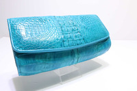 Женская сумка-клатч из натуральной, фактурной кожи крокодила голубого цвета. Ширина-25см, высота-13см, толщина-8см. Изделие данной модели может быть использовано и как женская плечевая сумка и как женский ручной клатч. Металлическая цепочка, звенья которой оплетены кожаным шнурком, цепочка используется в качестве плечевого ремешка и поставляется в комплекте с данным изделием. Пристегнув цепочку к сумке вы получаете плечевую сумку, отстегнув цепочку от сумки вы получаете ручной клатч. Крокодиловые клатчи данной модели отшиваются в двух размерах, в маленьком и в большом, эта большая модель. Для пошива крокодиловых сумок данной модели используется натуральная фактурная крокодиловая кожа, фактурная спинная часть шкуры крокодила. На лицевом клапане мы видим хвостовую фактуру крокодиловой кожи которая плавно перетекает на обратную часть сумки. Для придания данному клатчу максимальной подвижности и эластичности боковые вставки выполнены с применение кожи теленка, кожа теленка по цвету подобрана под цвет кожи крокодила. На лицевой части клатча устроен откидывающийся вверх лицевой клапан, в нижней части клапан фиксируется к сумке на магните. Плоская стенка делит внутренний объем клатча на два отдельных кармашка, внутри кармашков устроены отделения для карточек, одно из которых с прозрачным окошком, широкий плоский карман на молнии, карман устроен на всю ширину клатча и широкий, на всю ширину клатча плоский карман расположенный за карманом на молнии. На внутренней поверхности лицевого клапана вшиты металлический D-образные кольца для крепления съемного плечевого ремня-цепочки. В качестве материала подклада используется натуральная кожа теленка, подобранная по цвету с крокодиловой кожей и текстиль.
