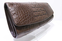 Женская сумка-клатч из натуральной, фактурной кожи крокодила коричневого цвета. Ширина-25см, высота-13см, толщина-8см. Изделие данной модели может быть использовано и как женская плечевая сумка и как женский ручной клатч. Металлическая цепочка, звенья которой оплетены кожаным шнурком, цепочка используется в качестве плечевого ремешка и поставляется в комплекте с данным изделием. Пристегнув цепочку к сумке вы получаете плечевую сумку, отстегнув цепочку от сумки вы получаете ручной клатч. Крокодиловые клатчи данной модели отшиваются в двух размерах, в маленьком и в большом, эта большая модель. Для пошива крокодиловых сумок данной модели используется натуральная фактурная крокодиловая кожа, фактурная спинная часть шкуры крокодила. На лицевом клапане мы видим хвостовую фактуру крокодиловой кожи которая плавно перетекает на обратную часть сумки. Для придания данному клатчу максимальной подвижности и эластичности боковые вставки выполнены с применение кожи теленка, кожа теленка по цвету подобрана под цвет кожи крокодила. На лицевой части клатча устроен откидывающийся вверх лицевой клапан, в нижней части клапан фиксируется к сумке на магните. Плоская стенка делит внутренний объем клатча на два отдельных кармашка, внутри кармашков устроены отделения для карточек, одно из которых с прозрачным окошком, широкий плоский карман на молнии, карман устроен на всю ширину клатча и широкий, на всю ширину клатча плоский карман расположенный за карманом на молнии. На внутренней поверхности лицевого клапана вшиты металлический D-образные кольца для крепления съемного плечевого ремня-цепочки. В качестве материала подклада используется натуральная кожа теленка, подобранная по цвету с крокодиловой кожей и текстиль.