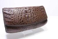 Женская сумка-клатч из натуральной, фактурной кожи крокодила темно-коричневого цвета. Ширина-25см, высота-13см, толщина-8см. Изделие данной модели может быть использовано и как женская плечевая сумка и как женский ручной клатч. Металлическая цепочка, звенья которой оплетены кожаным шнурком, цепочка используется в качестве плечевого ремешка и поставляется в комплекте с данным изделием, пристегнув цепочку к сумке вы получаете плечевую сумку, отстегнув цепочку от сумки вы получаете ручной клатч. Крокодиловые клатчи данной модели отшиваются в двух размерах, в маленьком и в большом, эта большая модель. Для пошива крокодиловых сумок данной модели используется натуральная фактурная крокодиловая кожа, фактурная спинная часть шкуры крокодила. В качестве украшения лицевой части клатча, в центральной части клапана расположена фактурная затылочная часть крокодиловой шкуры, переходящая в спинную часть на обратной стороне сумки. Для придания данному клатчу максимальной подвижности и эластичности боковые вставки выполнены с применение кожи теленка, кожа теленка по цвету подобрана под цвет кожи крокодила. На лицевой части клатча устроен откидывающийся вверх лицевой клапан, в нижней части клапан фиксируется к сумке на магните. Плоская стенка делит внутренний объем клатча на два отдельных кармашка, внутри кармашков устроены отделения для карточек, одно из которых с прозрачным окошком, широкий плоский карман на молнии, карман устроен на всю ширину клатча и широкий, на всю ширину клатча плоский карман расположенный за карманом на молнии. На внутренней поверхности лицевого клапана вшиты металлический D-образные кольца для крепления съемного плечевого ремня-цепочки. В качестве материала подклада используется натуральная кожа теленка, подобранная по цвету с крокодиловой кожей и текстиль.